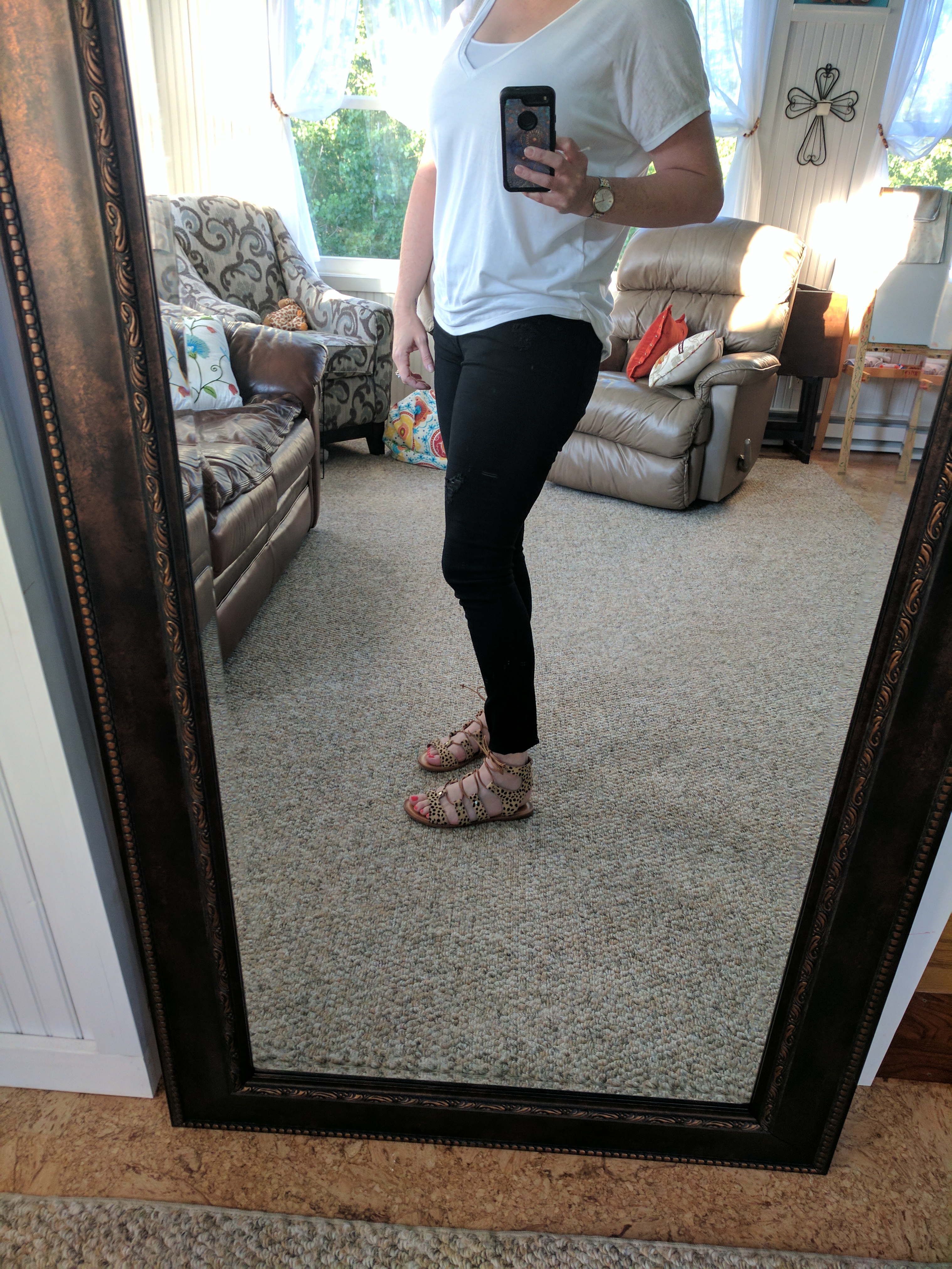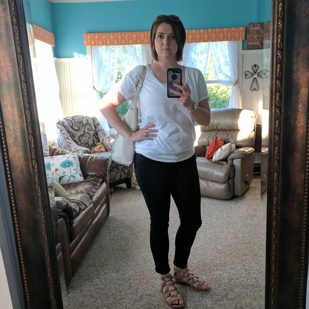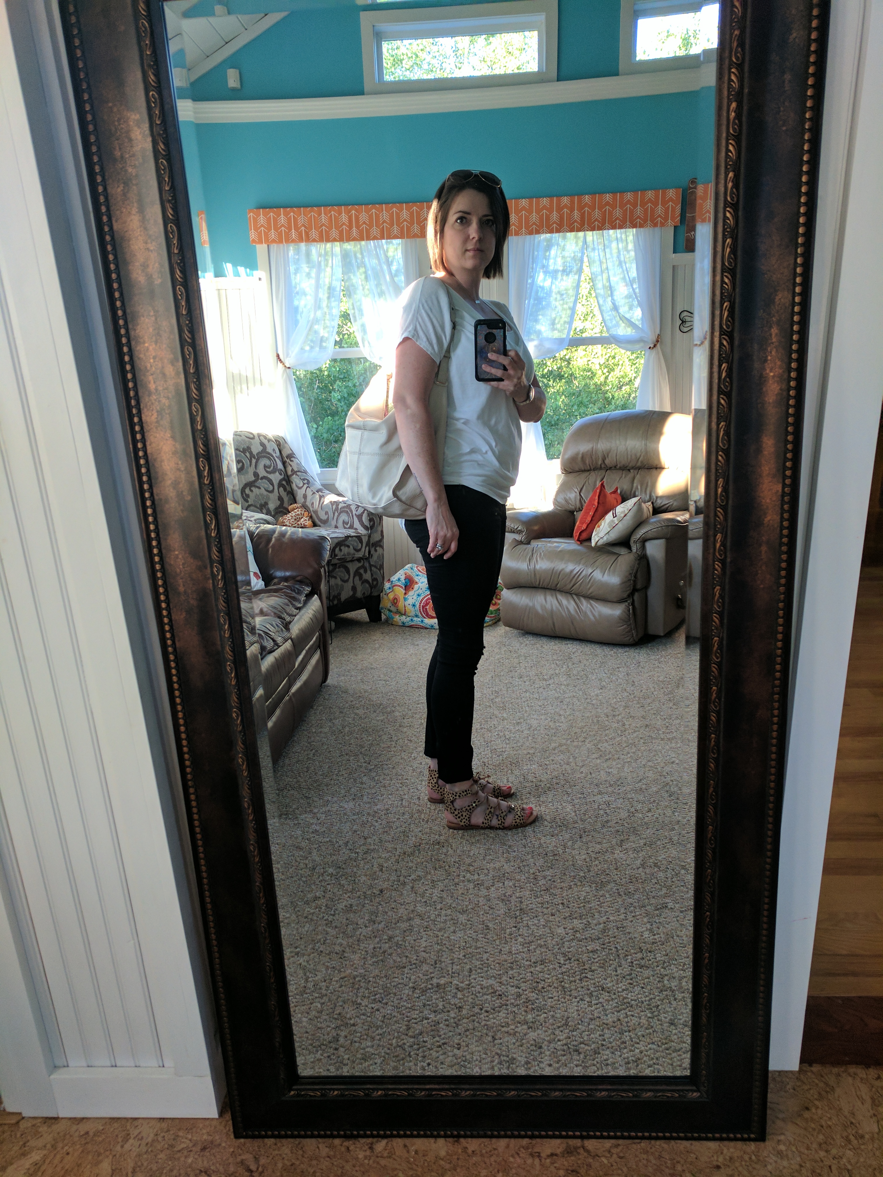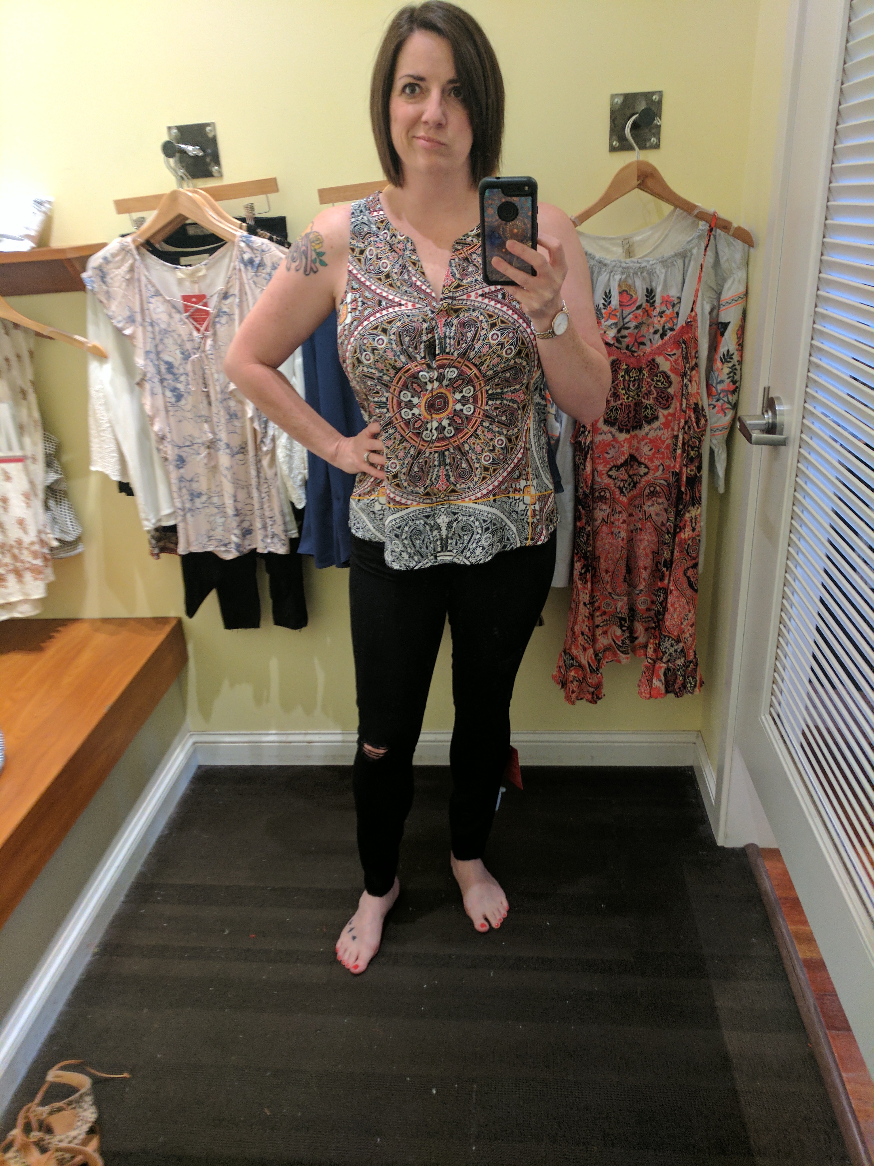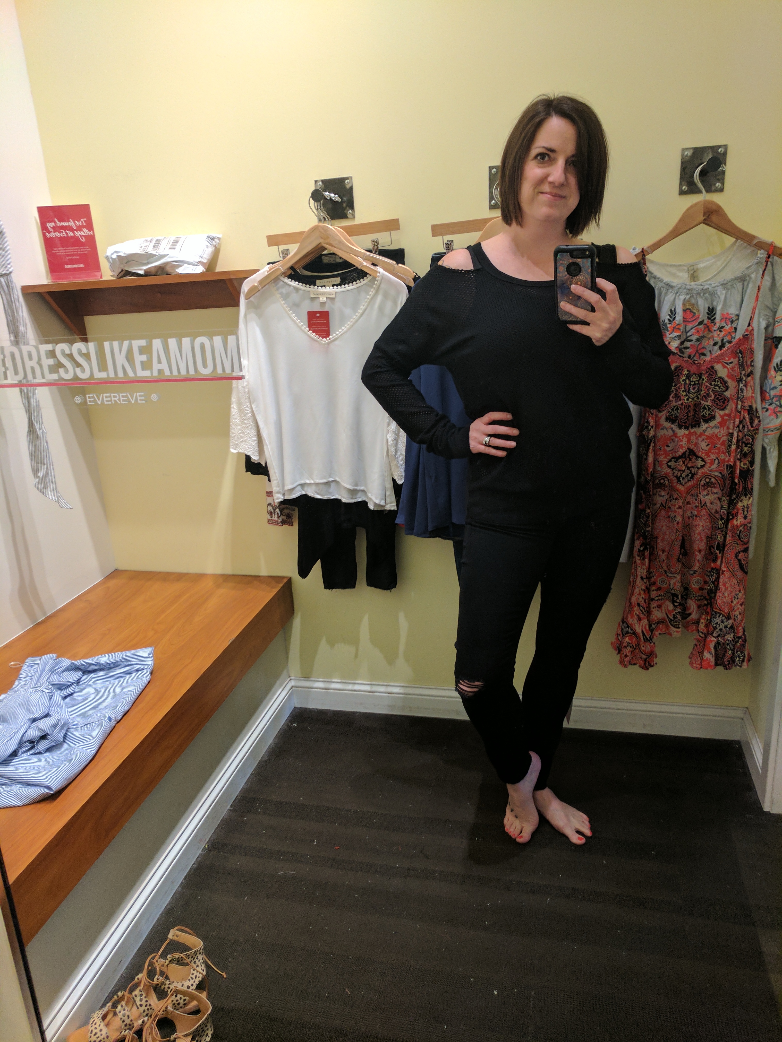 I tried on a top that I thought was super cute on the hanger but gaped open at the girls (see in the photos below). Nobody needs to see that. Next.
