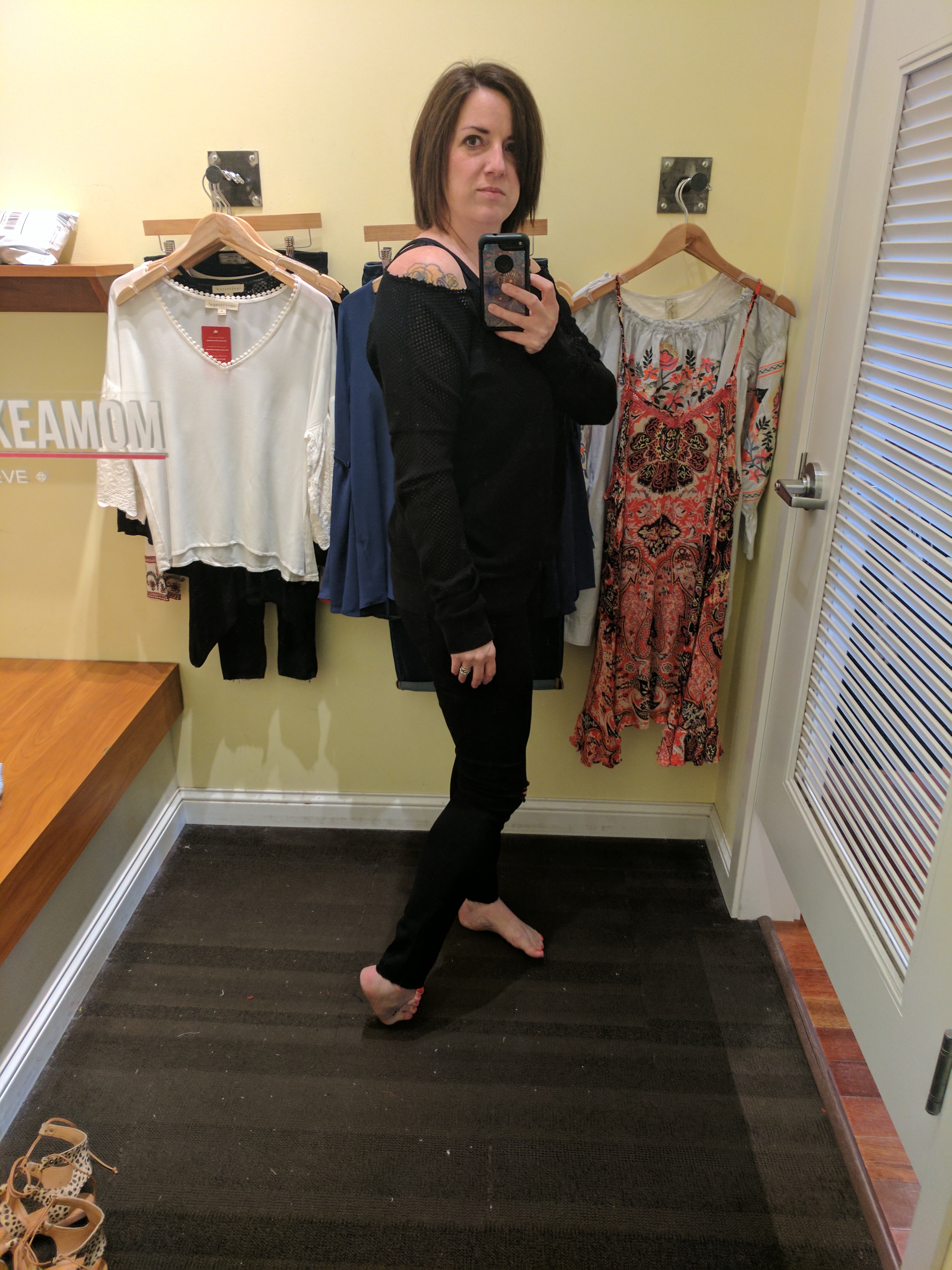 I tried on a top that I thought was super cute on the hanger but gaped open at the girls (see in the photos below). Nobody needs to see that. Next.