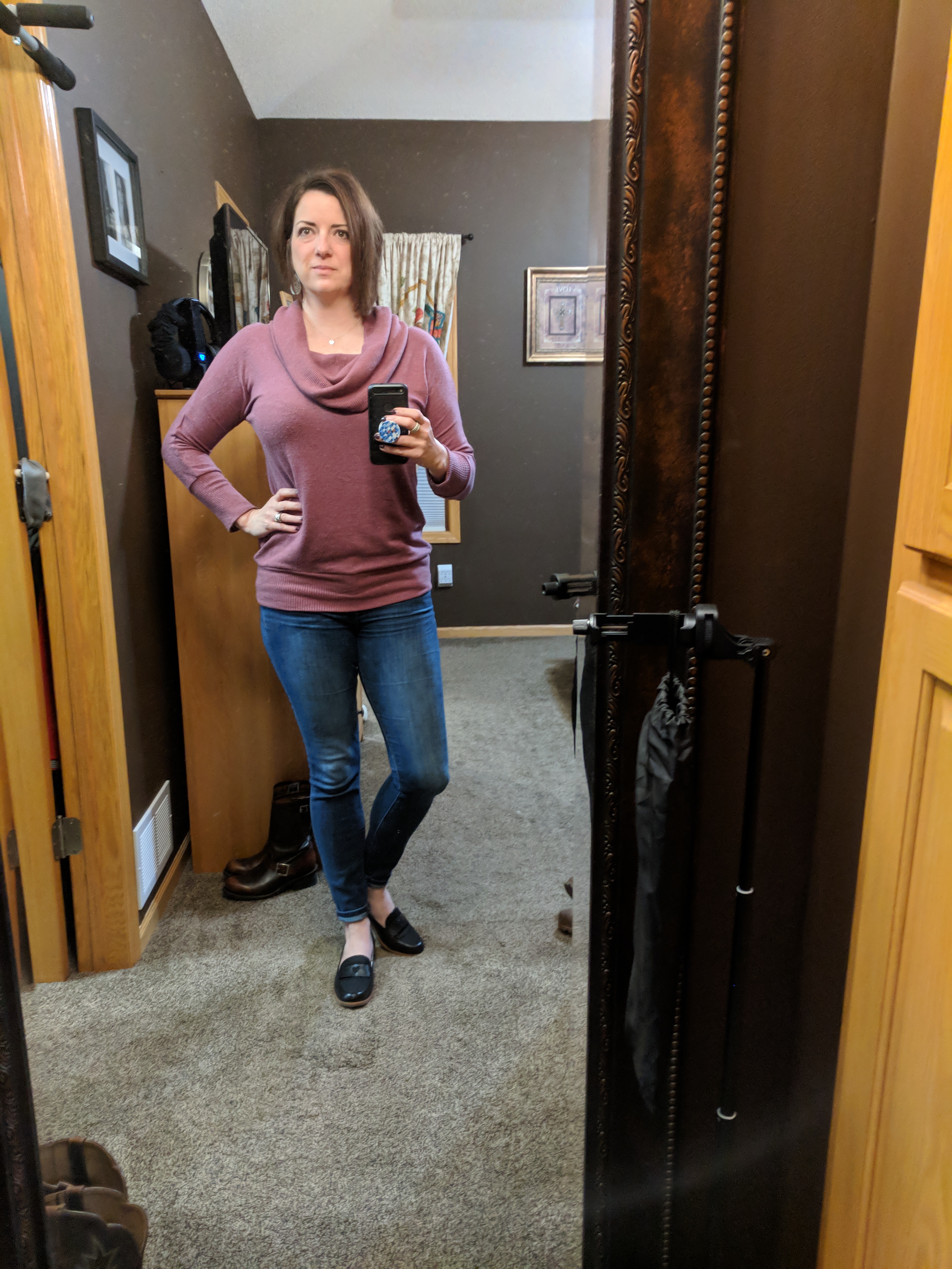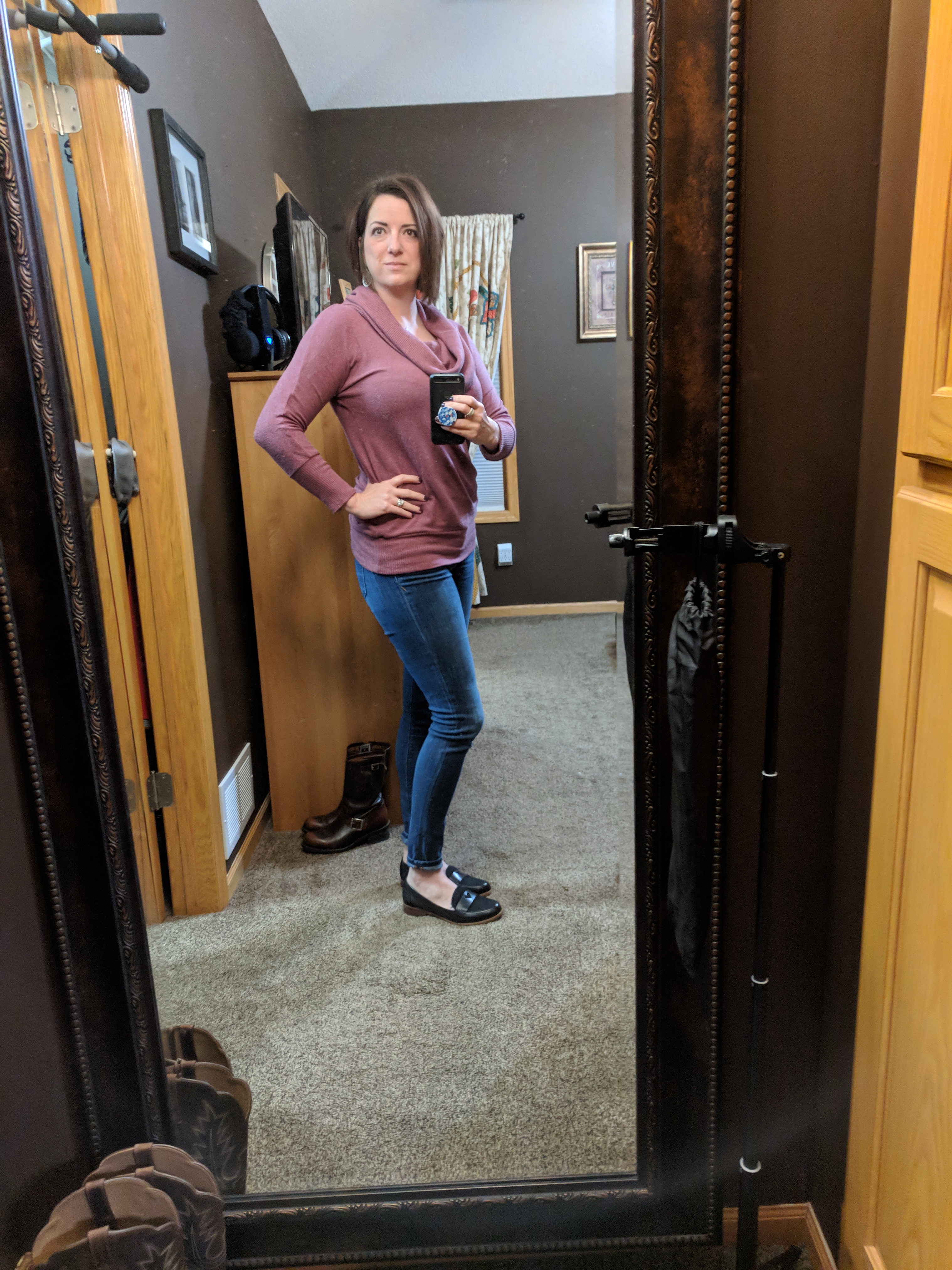 My jeans are from Evereve. They are comfortable with just enough stretch to compensate my mommy tummy. This sweater is last season but I’ve found one that’s very similar. I love a cowl neck sweater. Cozy meets chic. Shoes are ED Ellen Degeneres loafers again. I could wear them with anything! Bracelet and earrings are usually what I wear to dress something up or down. The boots you see in the mirror are my favorite for wearing with anything, anywhere.